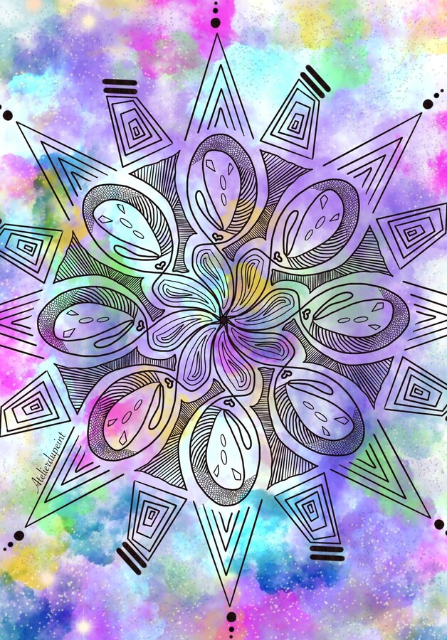 Au premier plan, la rigueur. Un mandala complexe, tracé à l'encre noire avec une précision quasi mathématique. Ses lignes nettes et ses formes géométriques ancrées offrent un point de stabilité, une structure rassurante.